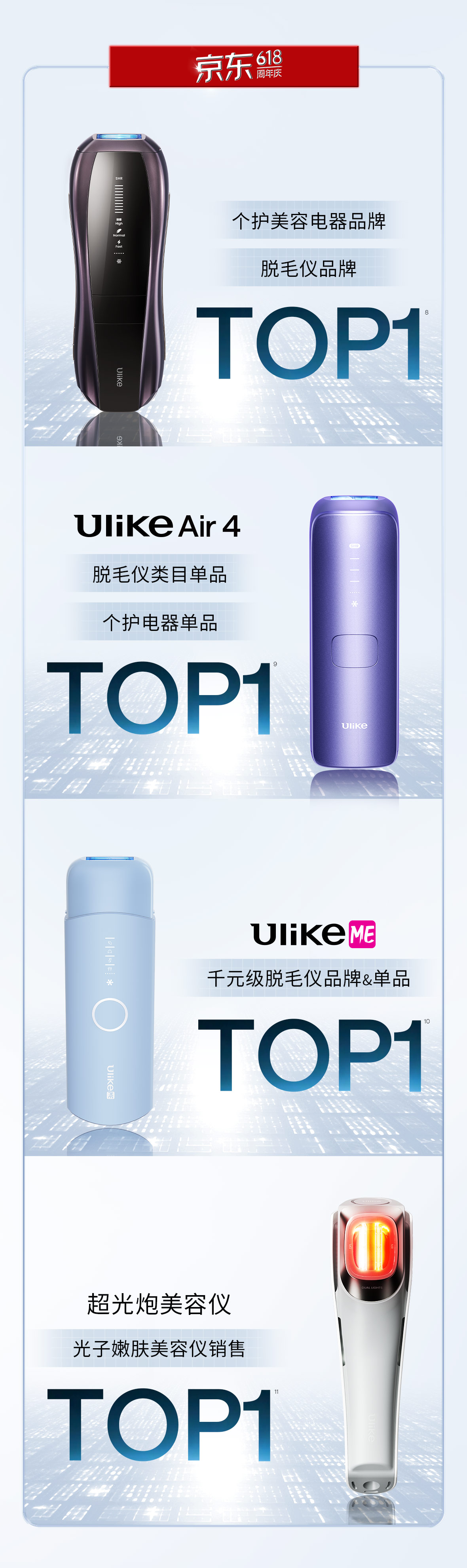 Ulike斬獲京東平臺“個護美容電器品牌”“脫毛儀品牌”“脫毛儀類目單品”“個護電器單品”“千元級脫毛儀品牌&單品”等多個榜單榜首;Ulike超光炮美容儀獲得“光子嫩膚美容儀”銷售Top1。
