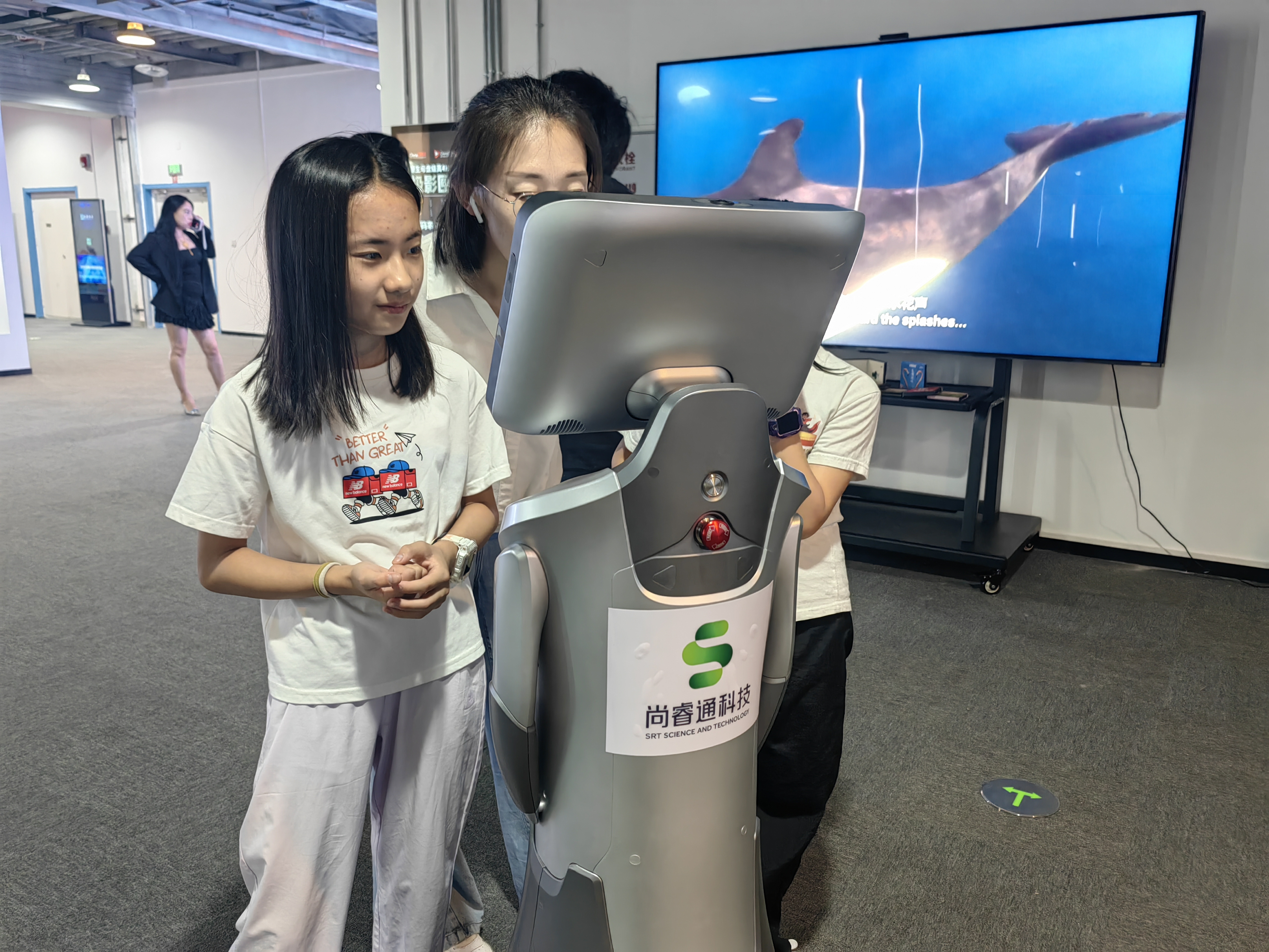 在數(shù)字體驗區(qū),一款智能機(jī)器人吸引了眾多孩子的目光,令他們駐足。機(jī)器人向孩子們拋出一個個妙趣橫生的問題,并巧妙引導(dǎo)他們探尋答案。