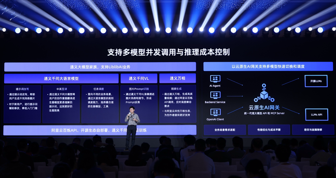 在社區(qū)層面,LiblibAI通過接入通義系列模型實現(xiàn)多模型并發(fā)調(diào)用與推理成本控制。在提示詞環(huán)節(jié),針對圖像風格和中英語言問題,通義千問可對用戶提示詞進行改寫,并翻譯成圖像模型能夠理解的描述。此外,用戶還可提供參考圖片,通過通義千問VL進行識別,更準確地描述想要生成的圖片風格和細節(jié)。在模型選擇上,通義千問可根據(jù)用戶需求對模型進行規(guī)劃調(diào)度,同時阿里云云原生AI網(wǎng)關支持多模型的快速切換,幫助控制推理成本。在生成環(huán)節(jié),高峰期間用戶可直接調(diào)用百煉平臺API來使用通義萬相模型,生成10秒以上的視頻。
