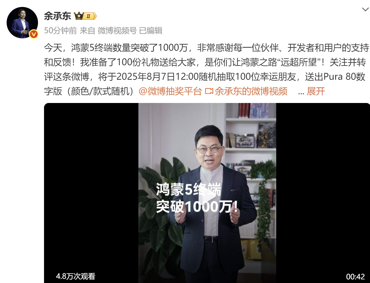 7月30日,華為常務(wù)董事、終端BG董事長余承東亦在微博發(fā)文稱,今天,鴻蒙5終端數(shù)量突破1000萬。