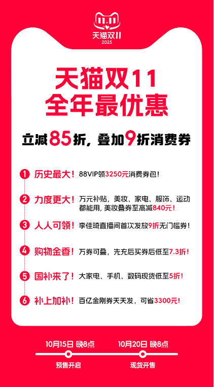 今晚8點(diǎn),天貓“雙11”預(yù)售開啟,10月20日晚8點(diǎn),可付尾款,正式現(xiàn)貨開賣。無門檻加“疊中疊”,一年最優(yōu)惠時刻即將來臨。